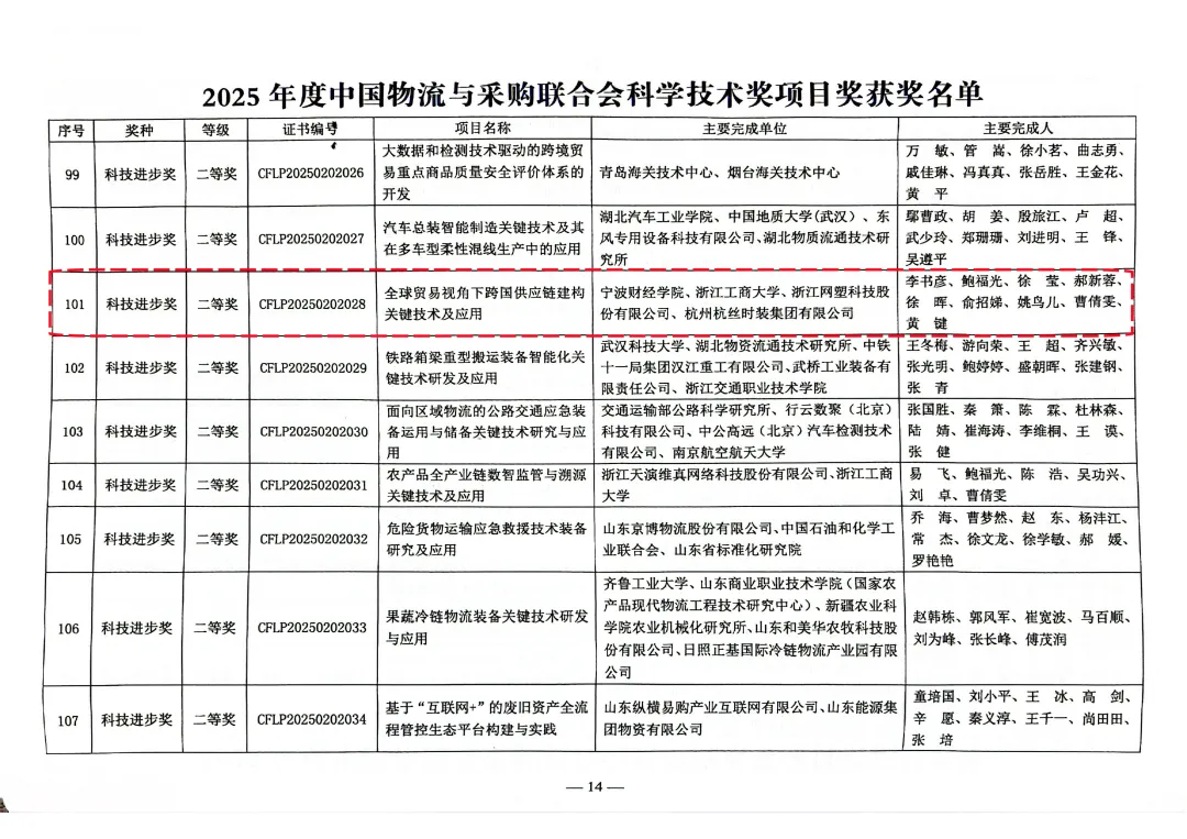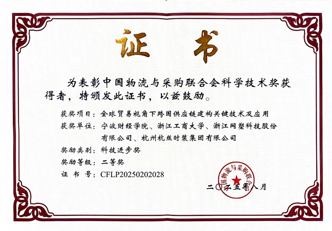 近日,中国物流与采购联合会公布2025年度科学技术奖项目奖获奖名单。浙江网塑科技股份有限公司(以下简称“我司”)作为主要完成单位之一,与宁波财经学院、浙江工商大学、杭州杭丝时装集团有限公司联合申报的《全球贸易视角下跨国供应链建构关键技术及应用》项目从上千份项目申报材料中脱颖而出,荣获科技进步奖二等奖。